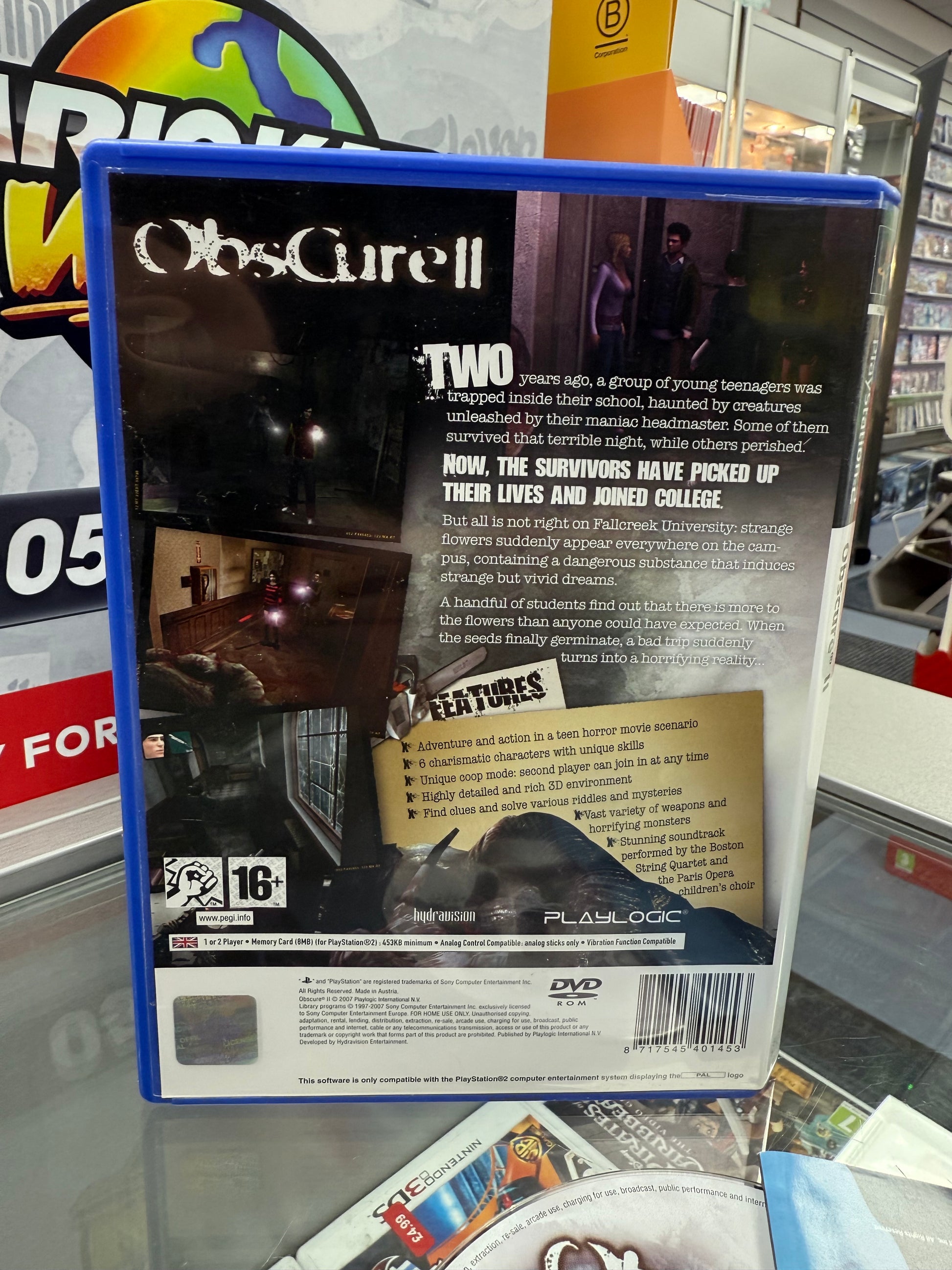 Two years ago, a group of young teenagers was trapped inside its school, haunted and hunted by creatures unleashed via biological experiments by their maniac headmaster, Herbert Friedman. Some of the youngsters survived that terrible ordeal, while others perished. In order to make it out alive, the teens gathered together to kill Friedman. Entirely justified in their act of revenge, the survivors have picked up their lives and are all in college. But not everything is right at Fallcreek University. Strange black flowers have suddenly appeared all over the campus, and they contain a substance that induces weird but vivid dreams. A handful of students discover that there is more to the flowers than anyone could have possibly expected. When the seeds finally germinate, a bad trip suddenly turns into a horrible reality. Obscure II enables you to choose a playable character and one AI-controlled sidekick. There are six playable characters in total, each with their own unique abilities. These can be switched at various points in the game. Obscure II also includes a co-operative option where a pair of friends can team up and attempt to survive the game together.